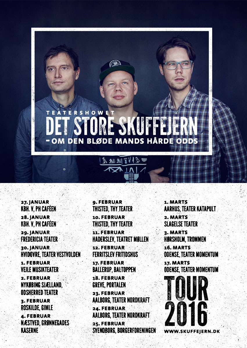 Per, Per & Peter [hhv. Vers – rapper, Helge – storyteller og Dyreborg, poetry slammer) tager teatershowet DET STORE SKUFFEJERN rundt i landet i februar og marts. En aften om den bløde mands hårde odds. Du kan ikke relatere, men det kan din dame. Kom og grin højt og brovtende af de fissepiskede frontkæmpere for det post-post-feministiske samfund, som i HVERT fald ikke angår dig. Hvis du får lov af konen. Hun må hellere komme med så hun kan tjekke at du griner du rigtige steder. Disclaimer: for folk af alle køn M/K.